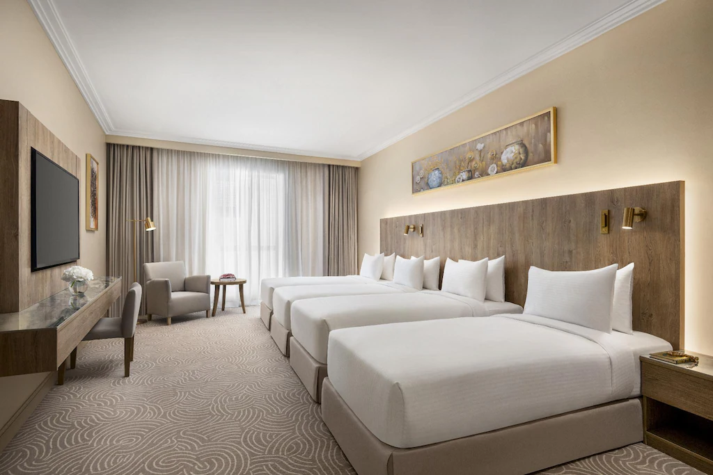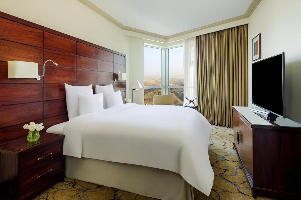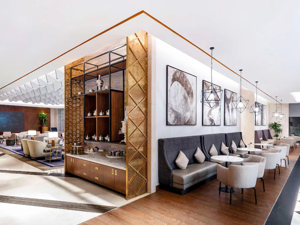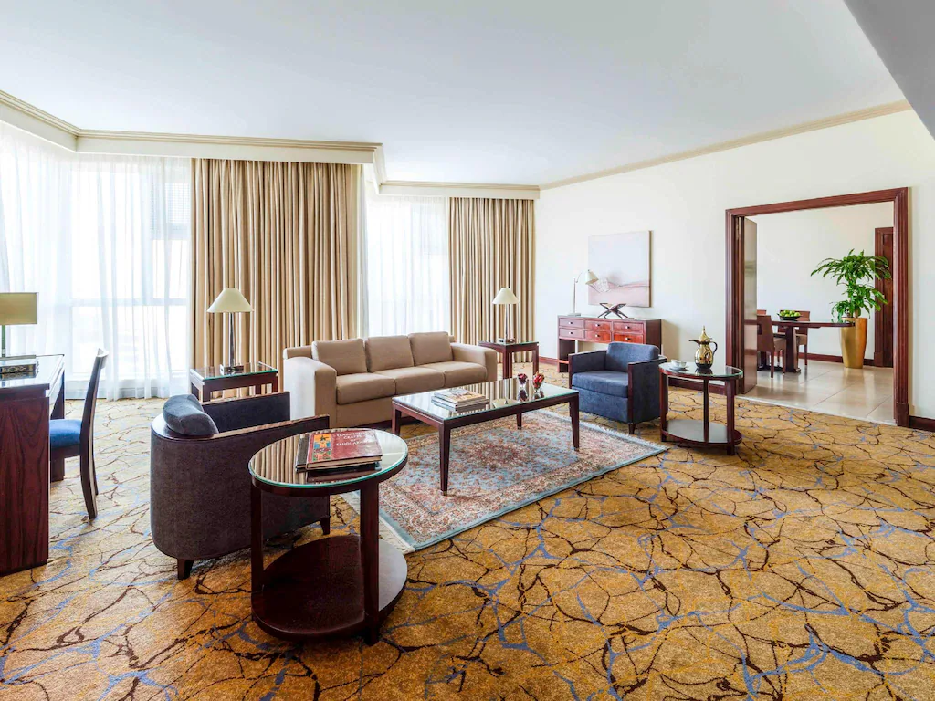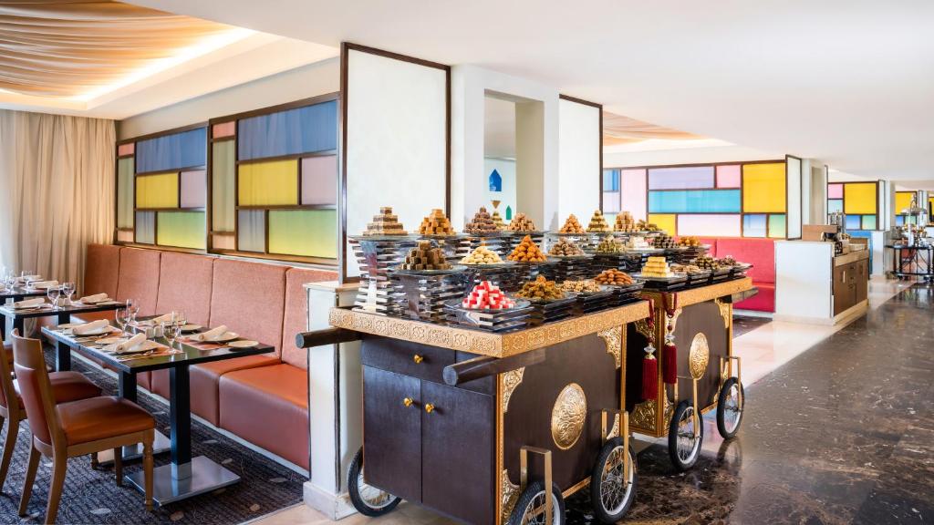 A lavish buffet breakfast is served daily, and guests can choose from a range of international and Middle Eastern dishes at the hotel’s restaurants. Mövenpick also provides business facilities, prayer areas, and concierge services for added convenience.