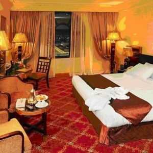 The hotel offers well-appointed rooms and suites, each thoughtfully designed with modern amenities such as air conditioning, flat-screen TVs, minibars, complimentary Wi-Fi, and private bathrooms featuring quality toiletries. Some rooms offer partial views of the city or the Haram area, enhancing the spiritual experience of guests.
